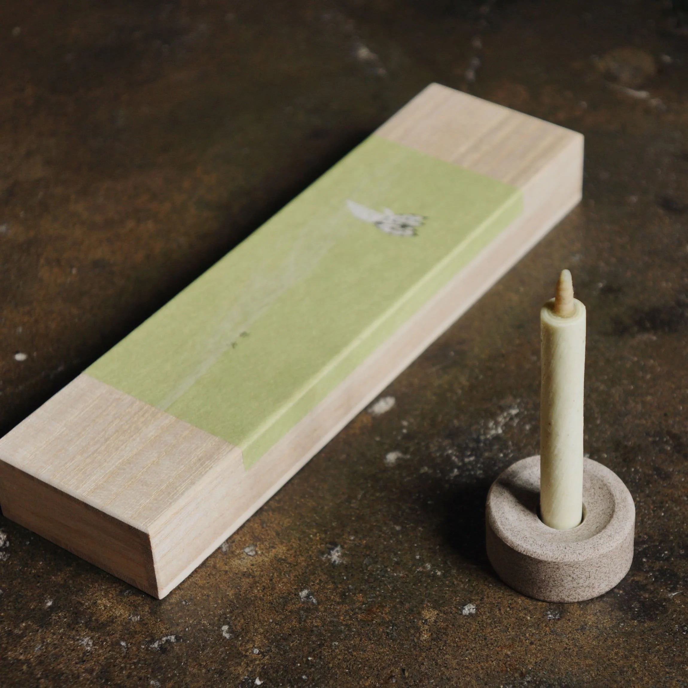 Material: Natürliches Sumach-Wachs, Docht aus Washi-Papier, Kerzenständer aus Stein, Streichholzpackung