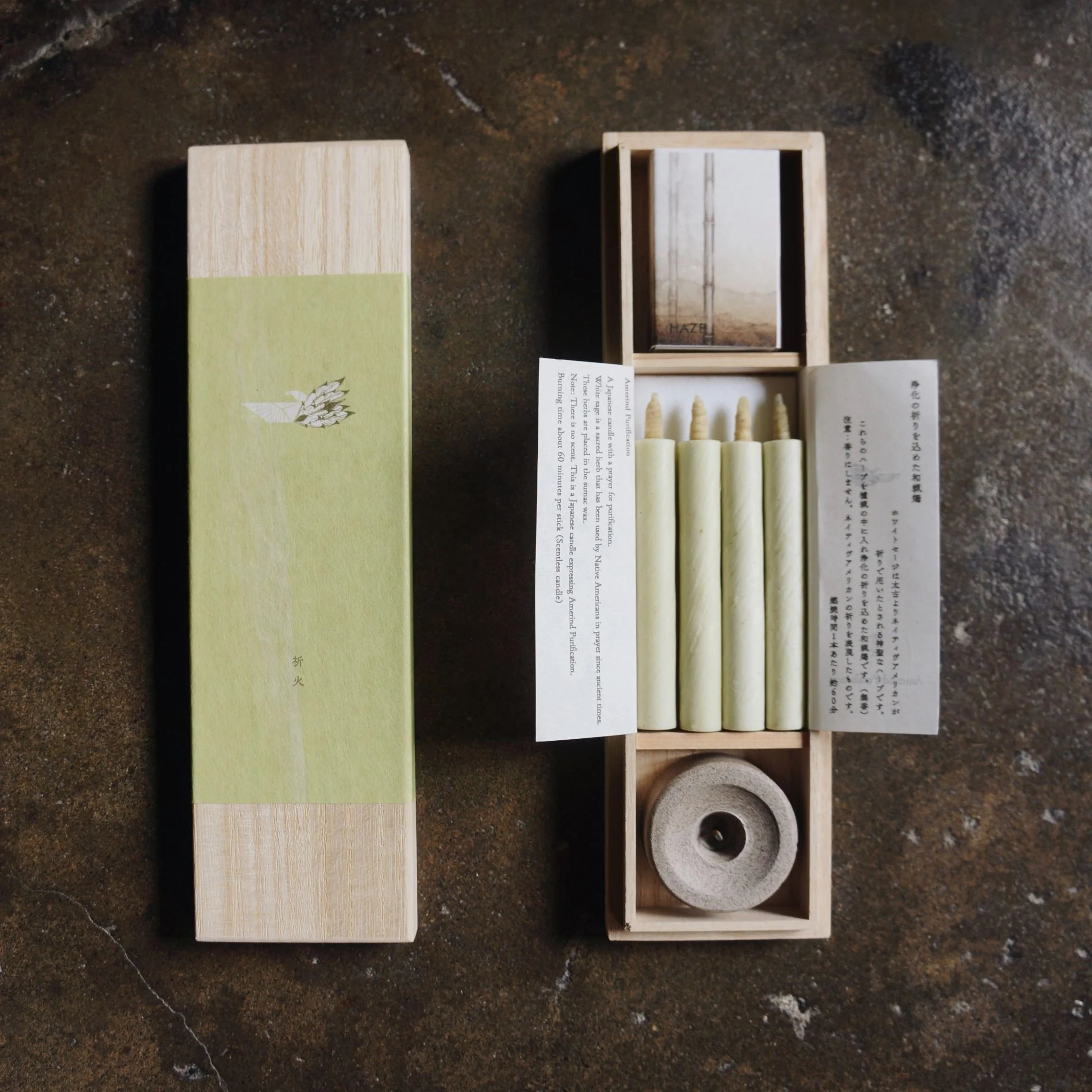 Diese duftneutralen, japanischen Kerzen (warosoku) werden aus natürlichem Wachs des Haze-Baums (Sumach) gefertigt und enthalten besonderes Salz zur Reinigung. Jede Kerze wird von Hand gefertigt und mit einem Docht aus Washi-Papier versehen.